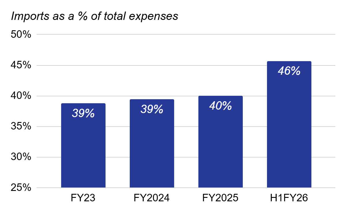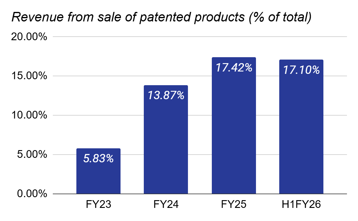 Twice as much revenue has already been generated from the sale of patented products in H1FY26 as it was in FY23. Sale of patented products is a stable source of revenue, though its share is still only about 1/5th of all sales.