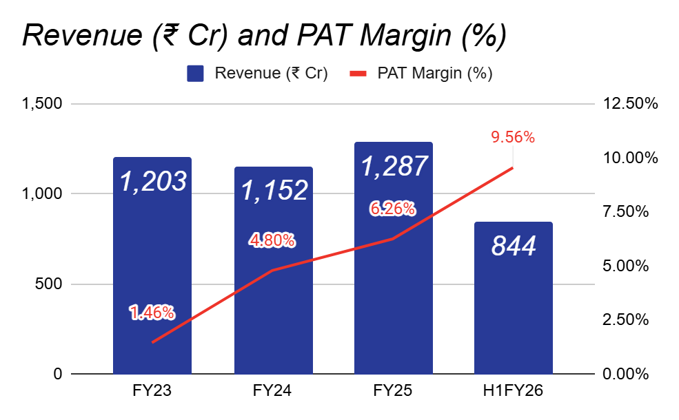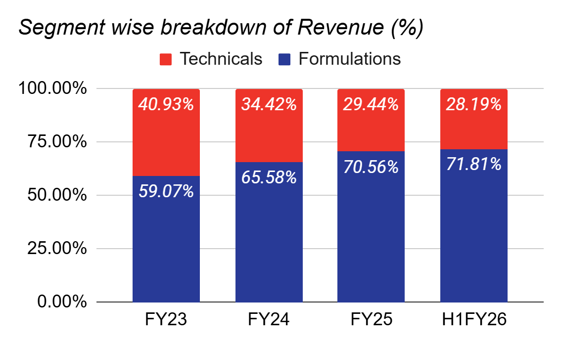 Formulations Revenue Mix: Formulations went from 59% in FY23 to 72% in H1FY26. This is the central driver that has helped improve its margins.