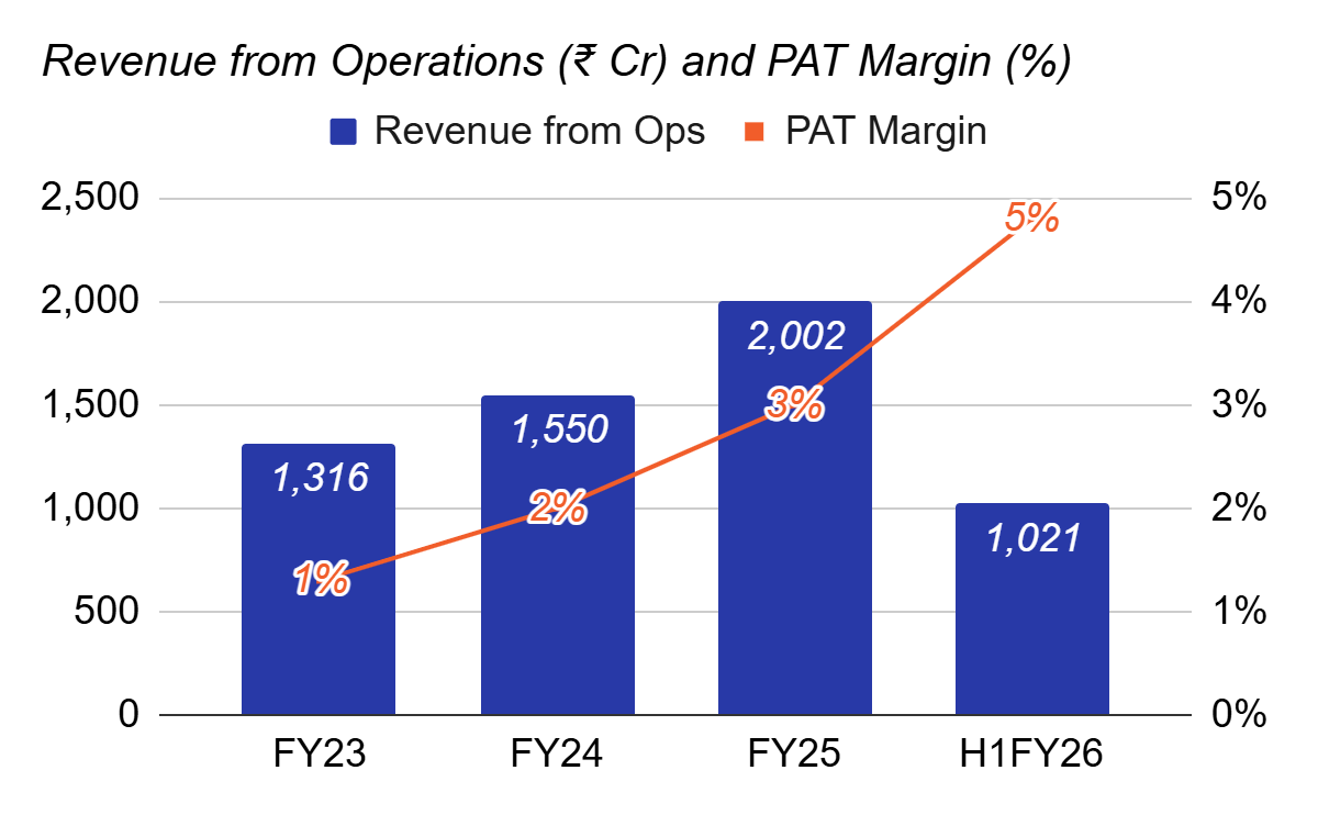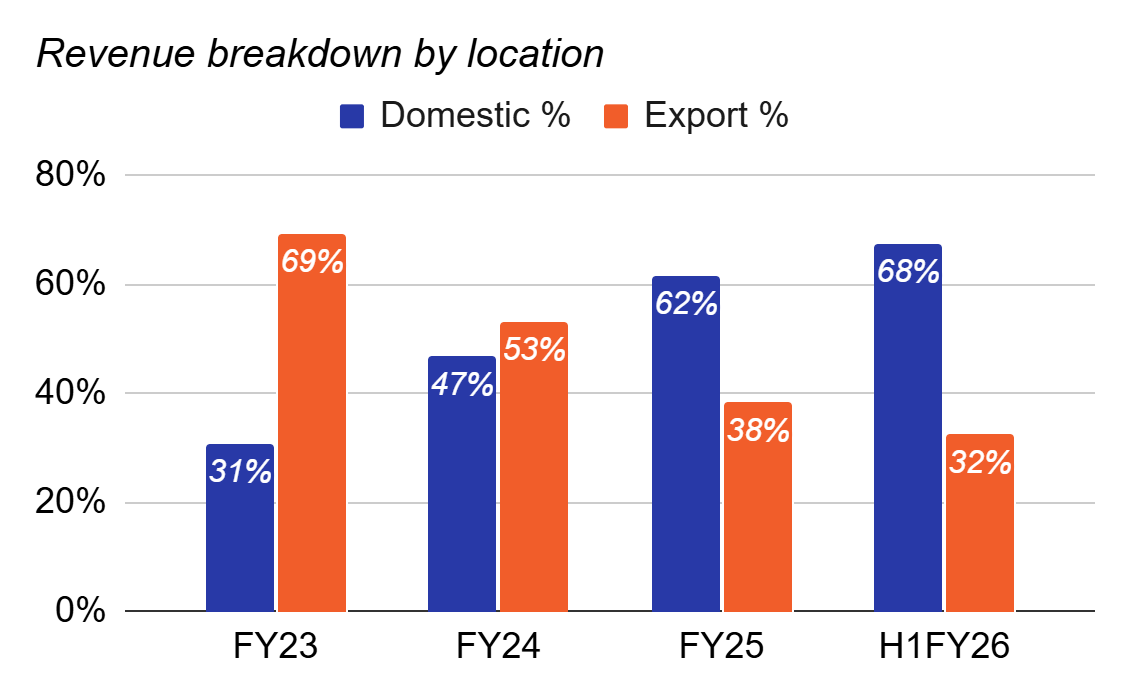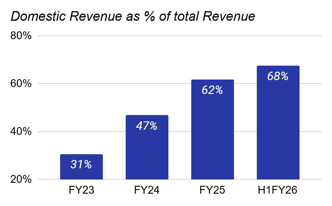 Revenue grew at a 52.1% CAGR from FY23 to FY25. Volumes grew 55.5% over the same period, specifically domestically. The key strategic shift is domestic-led growth. Domestic revenue has grown because the company has deliberately built up its domestic distribution network, while trying to maintain its international sales.